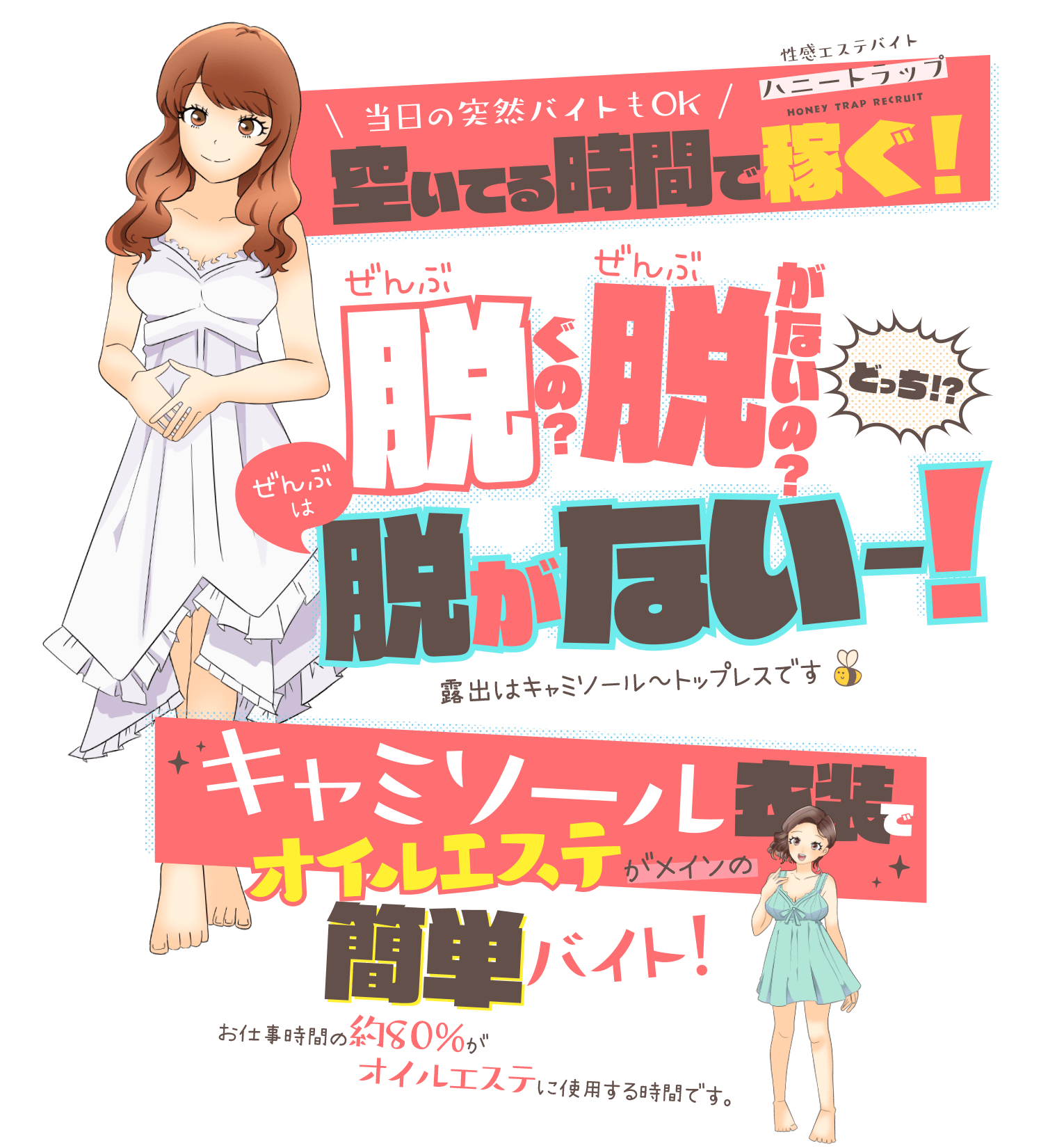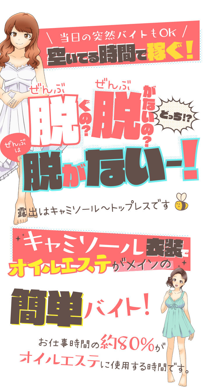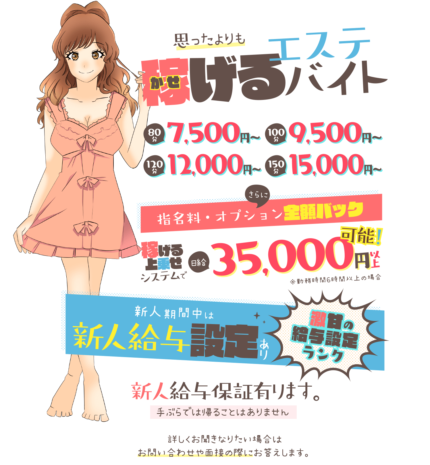 未経験者の女の子はエステ講習が約1時間程度ありますので当日体験バイトご希望の場合はそのお時間の予定でお願いします。