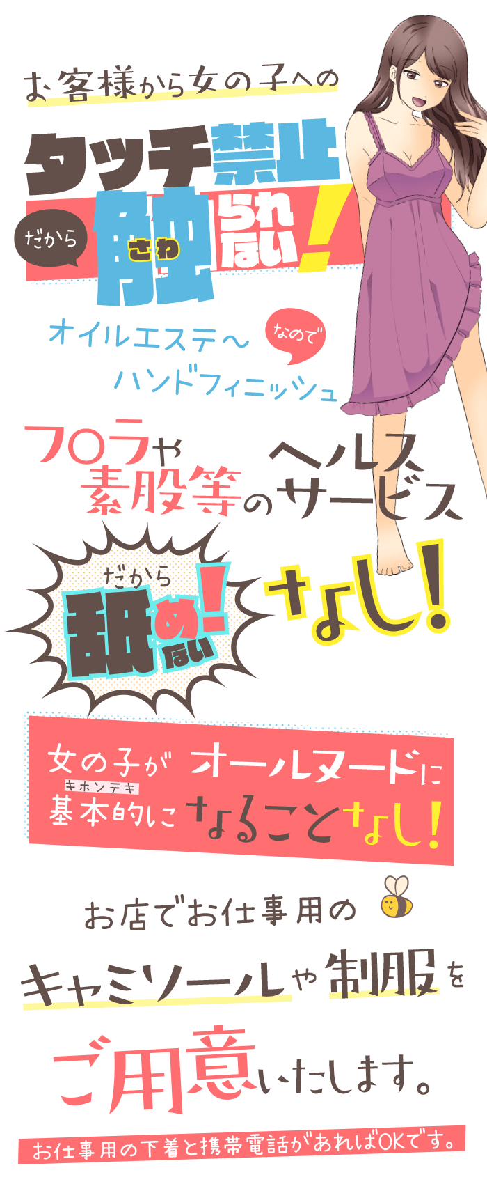 当店がオススメの理由としては、「プレイ時間の大半はオイルマッサージ」「露出はキャミソール~トップレス迄」「女の子の受身プレイ無し」「最後は手コキのみでフェラや素股無し」の性感エステ店舗だからです。又、仰向けの性感マッサージもお客様から遠い位置にいますのでお客様のタッチが届く距離ではありません。ですので取り組みやすいと思います。