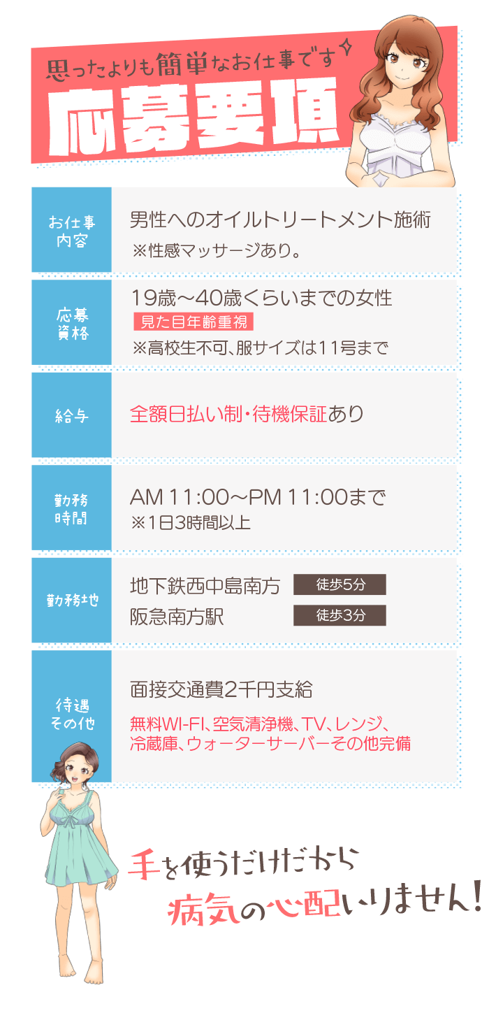 新大阪・西中島唯一の店舗型性感エステ ハニートラップ応募担当の松井です。当店においては当日の生理でのお休みをしてもらっても大丈夫です。女性にしかわからない体の辛さがありますのでそこは理解を示しています。