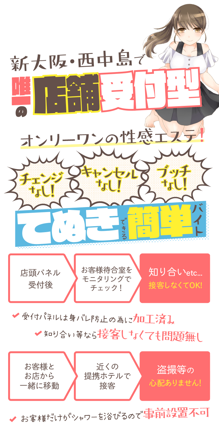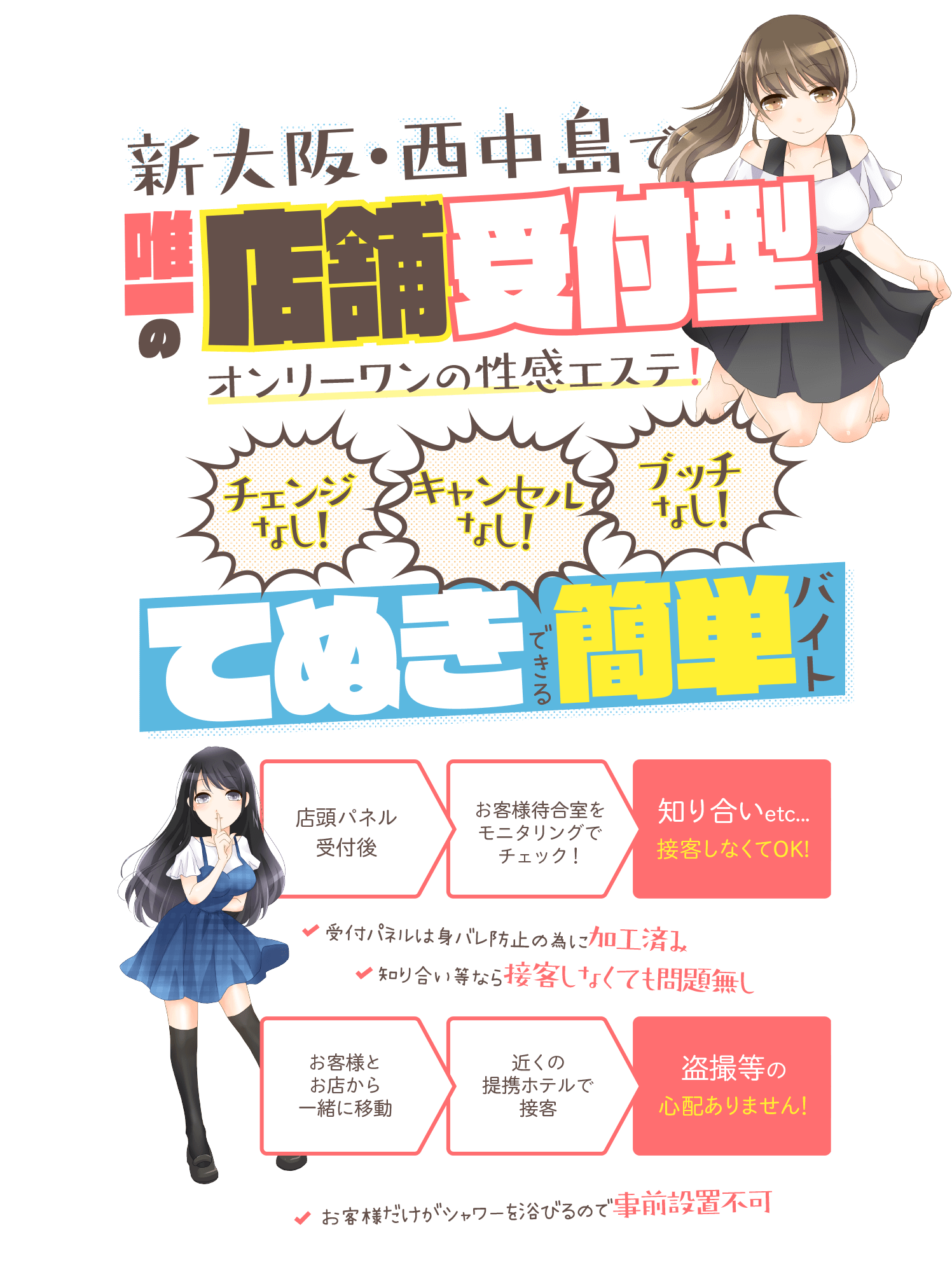 当店は所轄警察署に無店舗型特殊性風俗営業の届出をしていますのでご安心ください。また、西中島地域では唯一の店頭受付型の性感エステです。現在はデリバリーや待ち合わせは行っておりません。