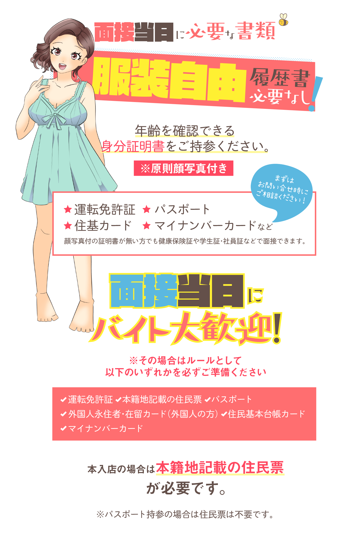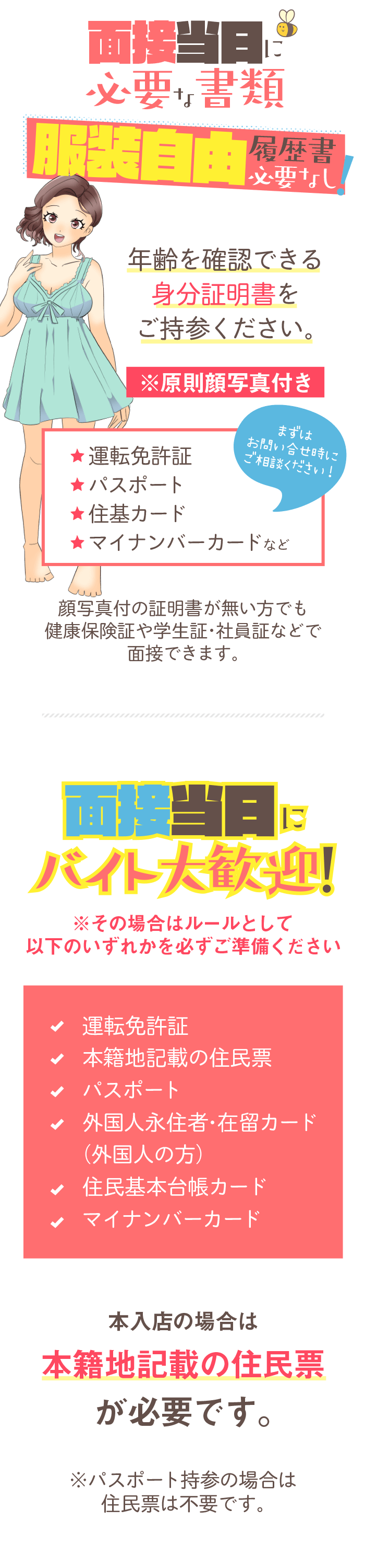 原則、18歳以上の女性は風俗で働くことはできます。その場合、顔写真付き身分証明書と本籍地記載の住民票の2点は必要です。(パスポートでもOK) そして、高校の卒業アルバムの御持参をしていただければ安全です。 (18歳以上でも、高校生は風俗で働けないので) ですので、当店は高校を通常の年数で卒業していると仮定した年齢の19歳からの応募受付しています。