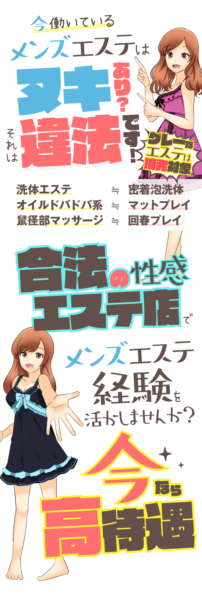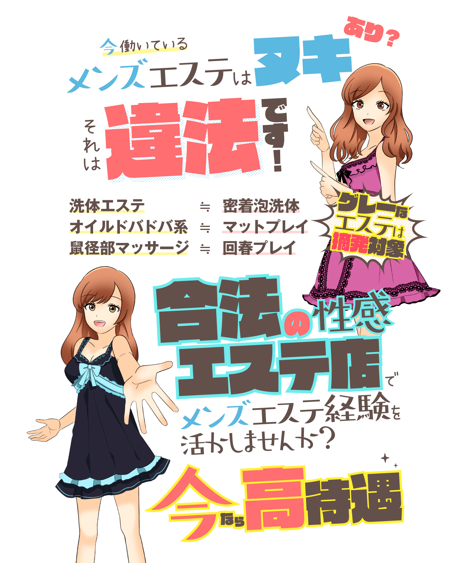マンションエステ(メンズエステ)は厳密にいうと風営法違反対象になりますので摘発される可能性が高いと思います。
